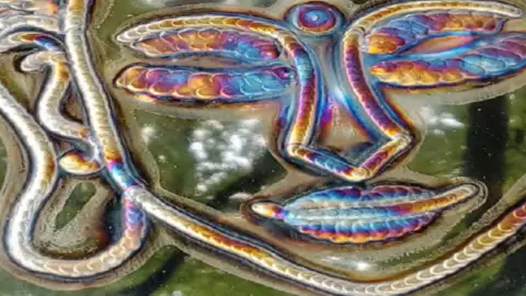 Ein flammendes Herz, ein lächelnder Buddha oder eine sich bedrohlich emporstreckende Kobra: Starke und einprägsame Motive haben es dem Schweiß-Künstler Dabs Wellington offenbar besonders angetan. Genauso beeindruckend ist allerdings die Optik: Die aus Edelstahl gefertigten Bilder schillern in allen Farben des Regenbogens, von zartgolden bis tiefblau. Alles, was der US-Amerikaner dafür braucht, ist ein Schweißgerät – und jede Menge Erfahrung.