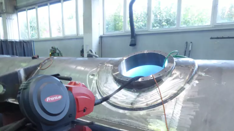 Der Einsatz einer TPS 500i mit 8 Meter langem PullMig-Schweißbrenners (MHP 320i PM W / MHP 280i PM G). Der durch das lange Schlauchpaket erweiterte Aktionsradius erlaubte es, auf das zweite Mannloch pro Segment zu verzichten und so den damit verbundenen Aufwand komplett zu sparen. Denn jedes zusätzliche Mannloch bedeutet eine potentielle Schwachstelle, an der Wasser eindringen könnte.