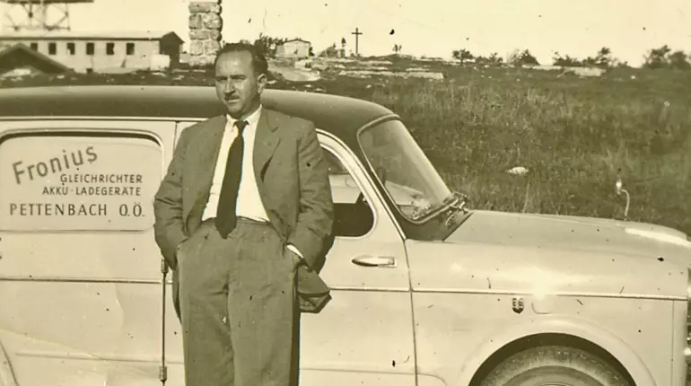 … con sistemas de carga de baterías. En 1945, el técnico capacitado en alta frecuencia Günter Fronius usó esta idea como la base para fundar su compañía familiar en Pettenbach, un tranquilo lugar al pie de los Alpes en Alta Austria. Las baterías para vehículos eran costosas y los sistemas de carga de baterías eran difíciles de adquirir, pero Fronius estaba listo para proporcionar una solución. Este fue el inicio de una auténtica historia de éxito …