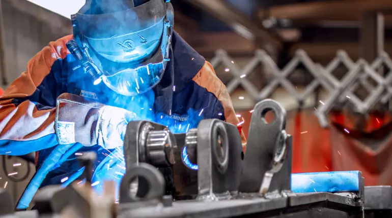 Ved produksjon av gravemaskinkomponenter er det uunnværlig med sveisesømmer av høy kvalitet. Under bruk må gravemaskinen tåle enorme krefter på de enkelte komponentene, som rammen, bommen eller skuffen. Perfekte sveisesømmer er et kriterium for sikkerheten.